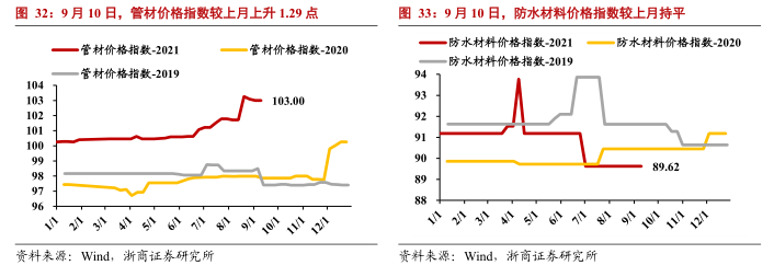 9月10日,管材价格指数103.0点,较上月上升1.29点,防水材料价格指数89.62点,较上月持平。
