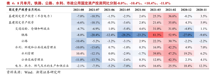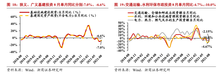 (2)基建:8月基建投资(不含电力)单月同比-7.0%,投资力度趋缓