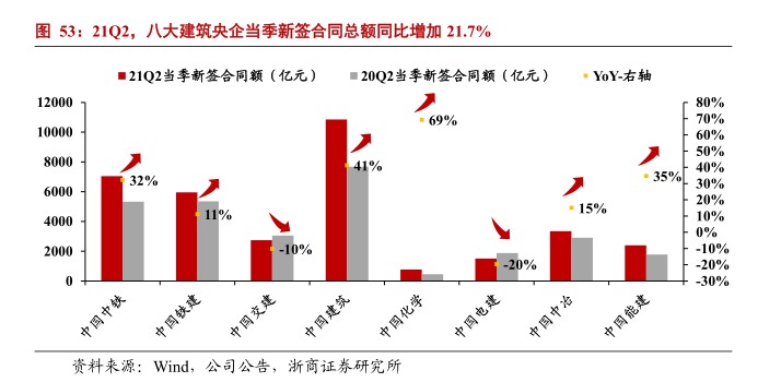 季度新签订单方面:八大建筑央企21Q2当季新签订单总额3.5万亿元,较20年同期增加6179亿元,同比增长21.7%。从订单金额看,中国建筑、中国中铁、中国铁建分别以10851.0亿元、7044.4亿元、5956.4亿元排名前三;从增速看,中国化学、中国建筑、中国能源建设分别以69.3%、41.3%、34.7%排名前三。