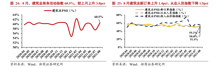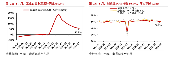 1-8月,制造业固定资产投资累计同比增长15.7%,8月单月投资同比+7.1%;采矿业固定资产投资累计同比增长6.7%,8月单月投资同比-3.5%。1-7月,工业企业利润总额累计同比+57.3%,较19年同期两年平均增长+20.2%,增速较6月回落9.6pct;7月,工业企业利润总额同比增加16.4%。8月,国内PMI指数50.1%,环比下降0.3pct,其中生产指数环比下降0.1个百分点至50.9%,新订单指数环比下降1.3pct至49.6%。