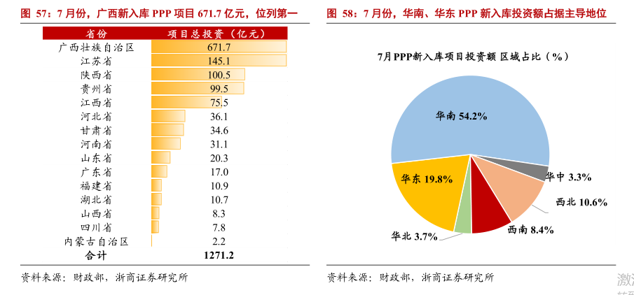 地区分布方面:7月新入库项目中,按省份看:广西、江苏两地投资金额分别为671.7、145.1亿元,分别占比52.8%、11.4%,位列前二;陕西、贵州、江西三地投资金额分别为100.5、99.5、75.5亿元,排名靠前。按区域看,华南、华东等区域占据主导地位,投资额分别占比54.2%、19.8%,剩余区域合计占比26.0%。