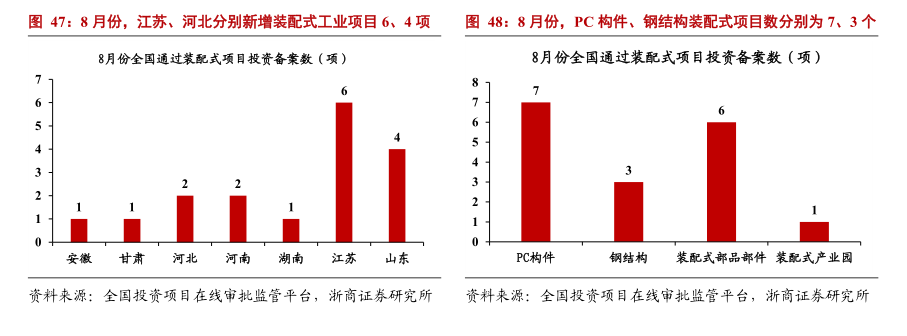 从地域分布看:2021年8月份,江苏、河北分别新增装配式工业项目6、4个,分别占比35.3%、23.5%。剩余省份合计新增装配式工业项目7个,占比41.2%。从装配式项目类型看:8月份,PC构件项目数7个,占比41.2%,剩余类型合计占比58.8%。