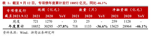 9月前两周专项债发行721亿元。截至9月12日,专项债年度累计发行18852亿元,同比-37.8%,净融资额15625亿元,累计同比-46.1%。