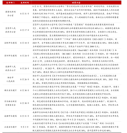 政策:政策驱动持续强化。自6月住建部印发《住房和城乡建设部2021年政务公开工作要点》后,8月到9月上旬,各省市持续出台政策推进装配式建筑发展,深入实施绿色建筑创建行动。至2025年,湖北省、烟台市拟分别实现新开工装配式建筑占新建建筑比例达到30%、40%以上,南昌市要求装配式建筑新开工面积占新建建筑总面积的比例达到50%。