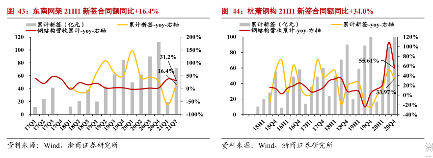 订单:21H1,A股五家钢结构上市企业新签订单合计366.9亿元,同比稳增17.1%,其中鸿路钢构杭萧钢构上半年累计新签同比分别+38.1%、+34.0%。