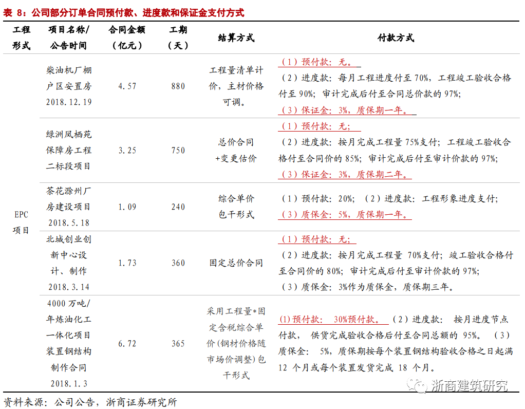 2)另一方面,各类订单均存在3%-5%的保证金尾款,一般合同会约定在工程竣工交付使用1-2年度过质保期后支付;大部分钢结构加工制作业务均有预付款;大部分设计施工总承包EPC工程订单无预付款。