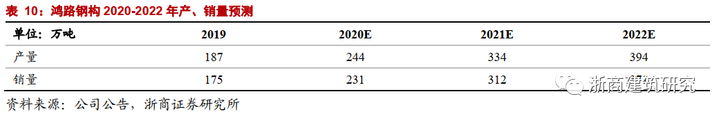 产销量预测:根据公司最新公告,鸿路钢构在建及已经完成建设的共有十大生产基地,全部建设完成后厂房面积将达400-450万平方米,确立了2021年底达到450万吨的年产能扩张目标。在梳理十大基地工厂建设进展基础上,结合公开信息,我们预测公司2020-2022年钢结构产量、销量数据如下:
