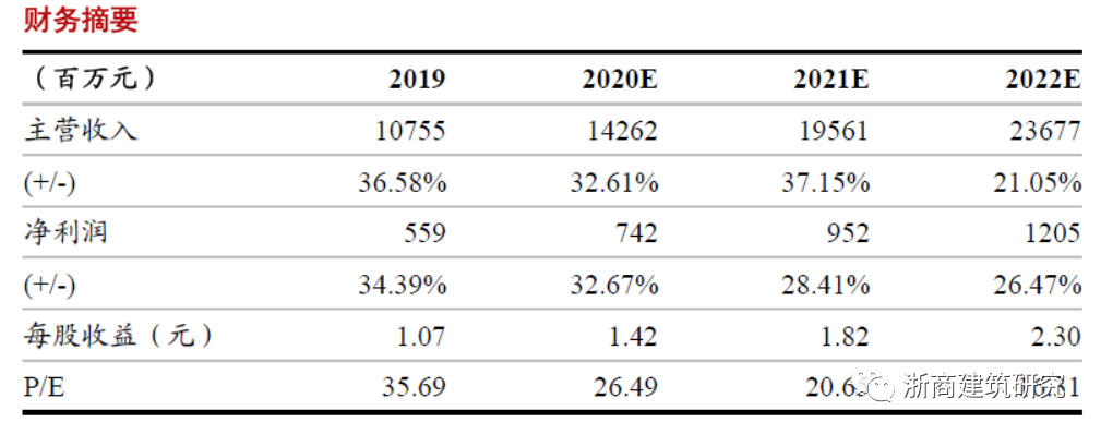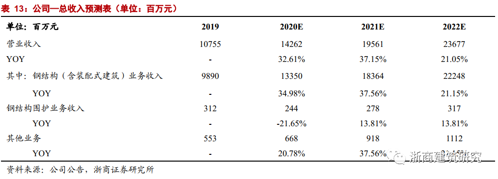 产能扩张背景下,我们充分考虑公司钢结构主业生产成本构成三要素:原材料、人工和能源动力未来可能出现的变动,以及钢结构围护销量后期修复。2015-2019年,公司钢结构(含装配式建筑业务)销售单价CAGR+4.68%,预计未来一段时期受政策持续催化,国内钢结构市场需求或将保持旺盛,我们偏保守假设未来3年公司钢结构销售单价年增速2%。在产能利用率爬坡背景下,预计毛利率短期不会有较大提升。我们预计2020-2022年,公司分别实现营业收入135.38亿元、182.06亿元和216.10亿元;实现归母净利润7.42亿元、9.52亿元和12.05亿元,同比分别增长32.74%、28.30%和26.58%。