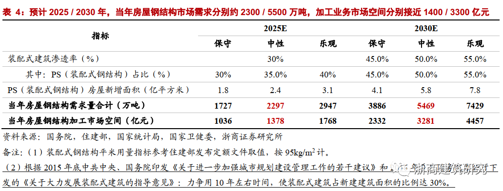 2020年8月底,住建部等9部委时隔25年下发《关于加快新型建筑工业化发展的若干意见》,提出大力发展钢结构建筑。根据我们测算,2025/2030年当年,房建钢结构需求量分别接近2300/5500万吨,市场空间分别接近1400/3000亿元。2020-2030年房屋钢结构需求总量约为2.5亿吨,钢结构加工市场空间合计近1.54万亿元;桥梁钢结构短期市场需求量约1000万吨/年,市场空间约900亿元/年;立体停车库市场空间有望达到500亿元/年;设备钢结构市场需求有望随我国能源、建筑央企参与海外“一带一路”沿线国家基建投资热度提升保持高增。
