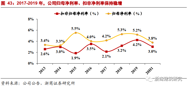 从利润率看,期间费用率大幅下降叠加各基地所在地政府对绿色建筑产业的持续性补助,公司扣非净利率和归母净利率保持稳增。2017-2019年,公司扣非净利率从2.1%稳步提升至4.2%,在此基础上,在以政府补助为主的非经常性损益平滑下,2016-2018年,公司归母净利率从2016年的4.0%稳步提升至5.3%,2019年以5.2%基本持平。