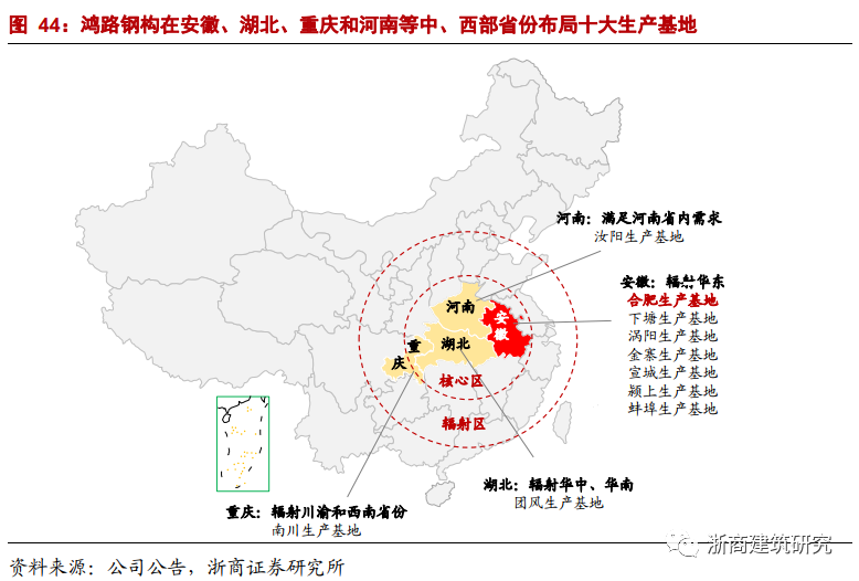 鸿路钢构产能集中布局于中、西部地区十大生产基地,用工易、政策优、原材料购入便利是选址时的主要考量因素。公司在中、西部地区4个省份共计10处基地进行工厂布局。安徽生产基地作为企业总部所在地,除深度覆盖安徽本省市场外,还可有效辐射至上海、山东、浙江等华东地区其他省份;湖北、重庆和河南基地可以分别辐射华中、华南和河南省内市场。公司十大基地均位于县级行政区,人工、土地成本较低且产业劳动力充足,政府对装配式建筑产业支持力度足,降低投资成本同时,提高毛利增厚业绩。