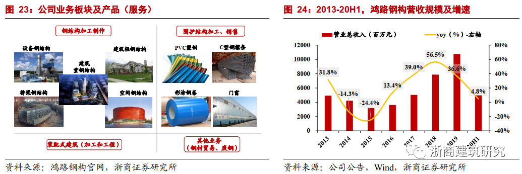 2015年起,鸿路钢构逐步加大钢结构加工订单承接体量,新签钢结构加工合同额占比和钢结构业务(含装配式建筑业务)营收占比双升。从合同金额占比看,公司当年新签钢结构加工制作订单合同金额占比从2017年67.8%迅速提升至2019年92.4%,2020年上半年,公司新签钢结构加工制作订单合同金额占比高达99.0%,工程订单业务占比逐年下降。从各项业务营收规模看,2016-2019年钢结构业务和装配式钢结构建筑业务营收合计分别为29.13、43.22、72.53和98.90亿元,CAGR+50.3%,实现连续3年扩张,营收占比从2016年 80.4%的低位迅速提升至2019年92.0%,20H1进一步提升至94.0%。
