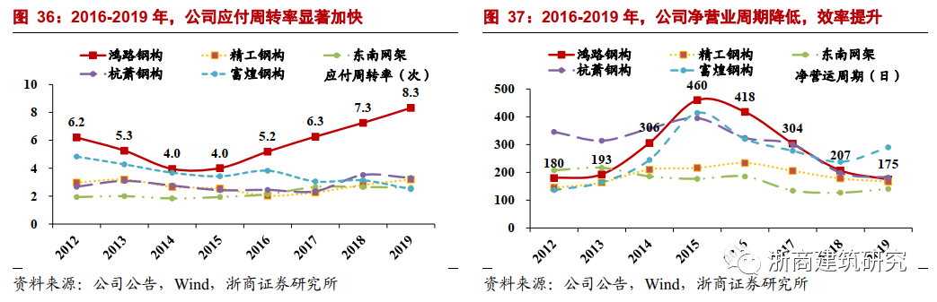 1)存货和应收账款方面:2017年起,鸿路钢构凭借有竞争力的定价策略和快速交货能力,承接了大量加工制作订单,此类订单通常工期要求紧、加工数量大,带动公司存货周转率从2017年1.5提升至2019年2.2,存货管理处于行业领先水平。随着钢结构行业景气度提升,公司获取的中小型体量的加工订单一般均有预付款,按月结算的付款机制叠加严控赊销、加大客户端回款力度,公司应收账款周转率从2015年底部1.9迅速提升至2019年6.5,在5家头部上市钢结构企业中排名第一。