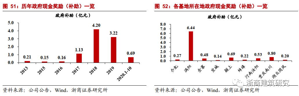 2013至2020年9月上旬,公司投资所在地政府陆续给予投资补助和产业奖励,累计9.71亿元,均为现金补助或奖励。从年份看,集中于2017-2019年区间;从地域看,涡阳县给予6.44亿元补助,在公司十大基地中最高。根据2020年三季报,公司尚有4.45亿元以政府补助为主的递延收益有待确认,预计后续将随各基地工厂投产陆续确认,有助于增厚公司利润。