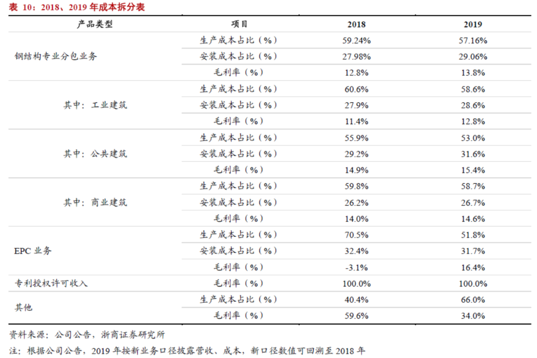 (1)成本构成:从公司披露数据看,钢结构专业分包业务中,工业建筑、商业建筑生产成本占比约60%、公共建筑生产成本占比约55%。根据行业经验,生产成本中,钢材成本占比例大致在65%左右,其余为直接人工成本、动力成本。