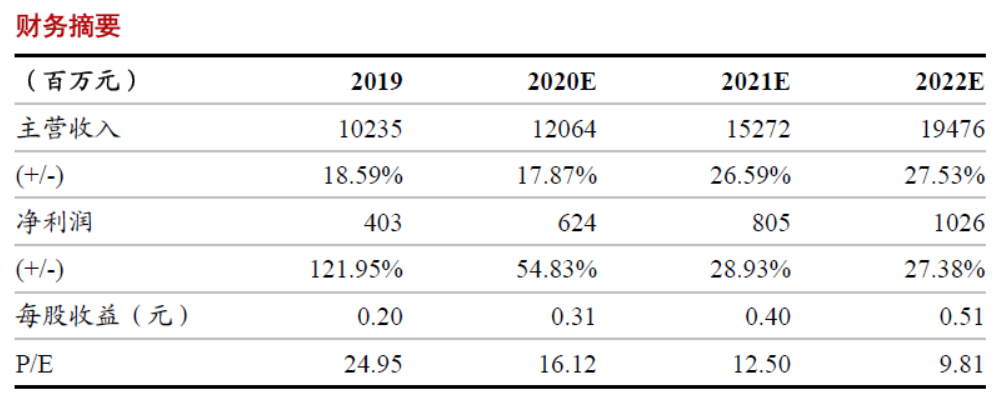 经测算,我们预计20-22年公司综合毛利率分别15.73%、15.87%、16.14%,最终预计公司2020-2022年净利润分别6.24亿元、8.05亿元、10.26亿元。