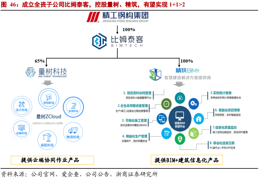 公司成立全资子公司比姆泰客(BIMTECH),初步完成旗下建筑信息化板块整合。据2020年7月16日公司公告,公司拟通过收购整合原有两家子公司浙江精筑和量数科技,成立全资专业化子公司。根据爱企查和公司官网,精工钢构于2020年10月注册成立全资子公司—比姆泰客信息科技(上海)有限公司,旗下控股浙江精筑和量树科技。通过此次整合,比姆泰客旗下建筑信息化软件将实现从装配式建筑设计、制造、运输、施工安装到运维全产业链覆盖。未来公司建筑信息化板块有望做大做强,逐步实现对外销售建筑信息化服务软件,从成本中心转为盈利中心。
