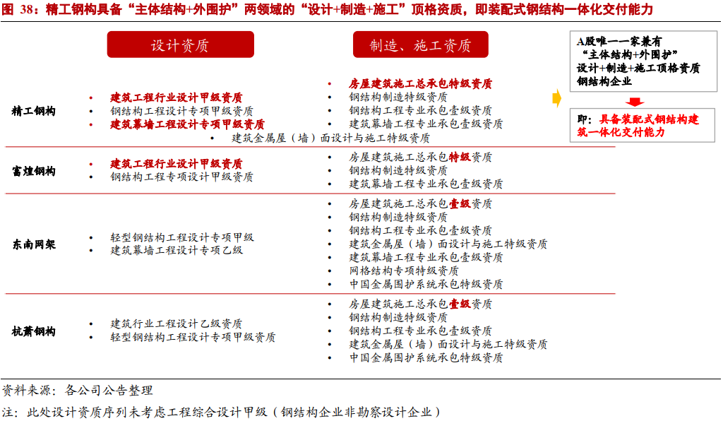 从业界横向看,精工钢构、富煌钢构、东南网架和杭萧钢构4家“一体化”经营模式钢结构龙头企业中,在设计资质方面,精工钢构为唯一具备建筑设计甲、钢结构专项甲、幕墙专项甲、建筑金属屋(墙)面设计等“主体结构+外围护+幕墙”全套设计资质企业;在施工资质方面,精工钢构和富煌钢构具备房建施工总承包特级资质。当前看,精工钢构拥有装配式钢结构行业设计、制造和施工顶格资质,具备一体化交付能力。综合来看,获得特级资质为公司构筑起“资质壁垒”,未来承接大型EPC项目有望获得先发优势。