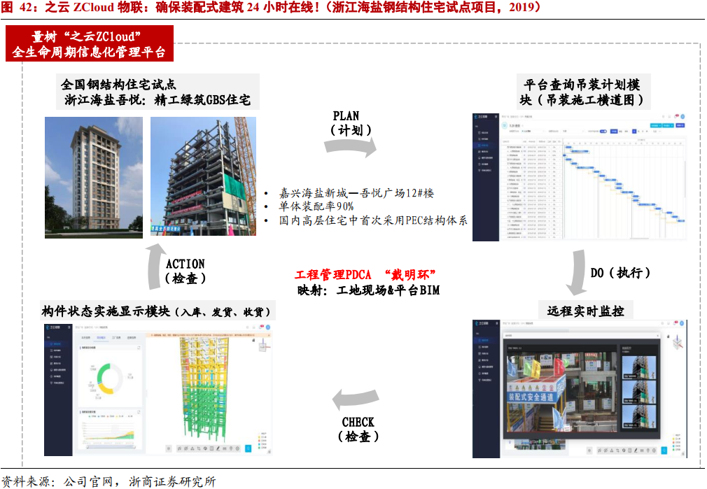 公司旗下“ZCloud”全生命周期信息化管理平台为之云解决方案中构件物流追踪的多人协同工作平台,可以实现提供构件追踪、进度模拟、进度预警等服务。之云物联以项目管理“戴明环”PDCA为核心逻辑架构,实现生产进度智能预警与管理,多工厂多项目信息综合管理等诸多功能。平台与之云仓库模块配合,运用PDA技术确保构件生产计划精准管理,实现仓储、运输路径可视化和构件质量完整追溯。“ZCloud”平台在2019年浙江嘉兴钢结构住宅试点项目中得到应用,促进了项目管理和施工效率双提升,为装配式项目管理和施工赋能。