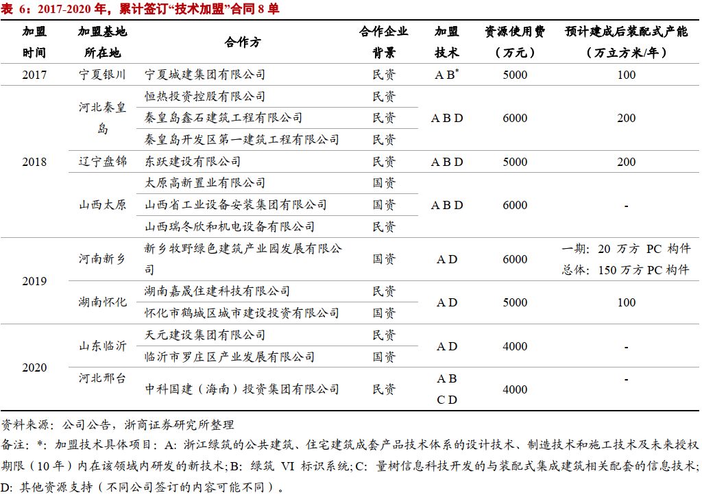 “专利授权”业务促营收稳步增长,新辟七大区域市场。得益于PSC集成建筑产品体系成套技术优势,叠加品牌优势与管理经验,公司推出“成套技术加盟合作”模式,即授权合作企业使用自身技术体系并提供相关服务,合作企业支付公司一笔资源使用费,同时,公司出资与合作企业与当地成立合资企业,用以开拓当地装配式建筑市场,合资企业公司占股9%-19%不等。继2017年与宁夏城建集团签署技术加盟首单后,2018至2020年10月,公司新签7单。至此打开了宁夏、河北、辽宁、山西、河南、湖南、山东等区域市场,合计资源使用费4.1亿元。“技术加盟”覆盖广大市场,轻资产方式推广PSC产品体系。