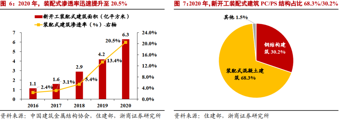 2020年,全国新开工装配式建筑共计6.3亿平方米,较2019年高增50%;装配式结构渗透率提升至20.5%,同比增加7.1pts,超额完成“十三五”既定15%渗透率目标,实现低位快增,装配式建筑行业保持高景气度。