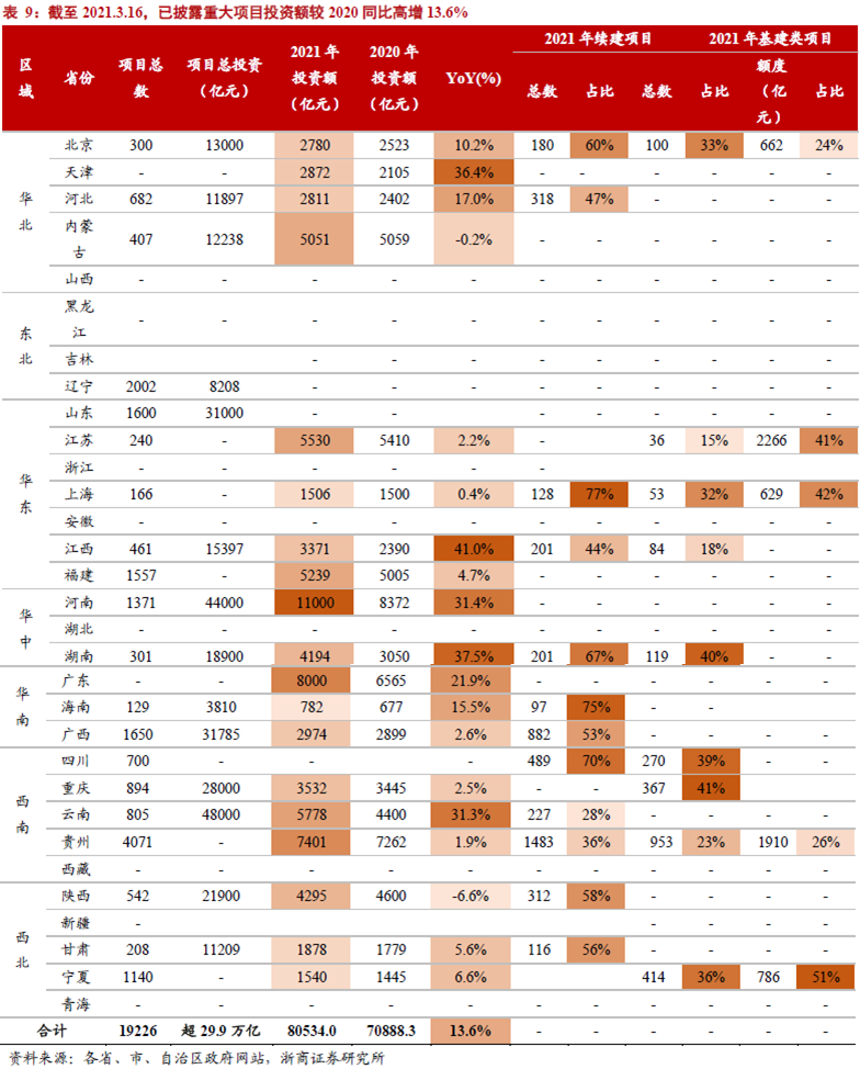 截至3月16日,已有19省份发布2021年度重大项目投资金额,本年度投资同比高增13.6%,我们认为“十四五”开局年基建投资力度料加大。截至3月16日,已有19省份公布2021年重大项目投资金额,合计超8万亿元,较2020大幅增加13.6%。上述19个省份中,除陕西、内蒙古外,其余省份2021年度投资额均高于2020年。存量续建项目方面,12个已披露具体数据省份中,有8个省份存量续建数量占比超50%,存量续建项目处于高位。从基建项目看,北京、上海、湖南、四川、重庆、宁夏基建项目数量占比均超30%(共9省份披露);从基建投资额看,北京、江苏、上海、贵州、宁夏21年基建项目投资占比分别24%、41%、42%、26%、51%。