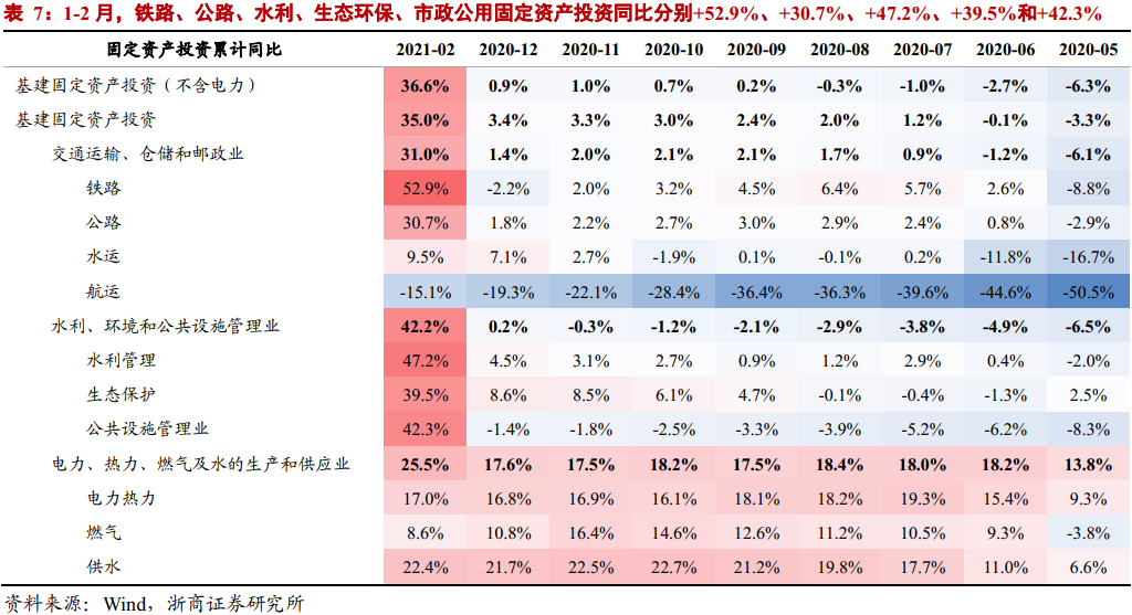 (2)基建:1-2月基建投资(不含电力)累计同比+36.6%;