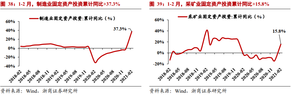 (3)工业:1-2月制造业、采矿业固定资产投资累计同比分别+37.3%、+15.8%