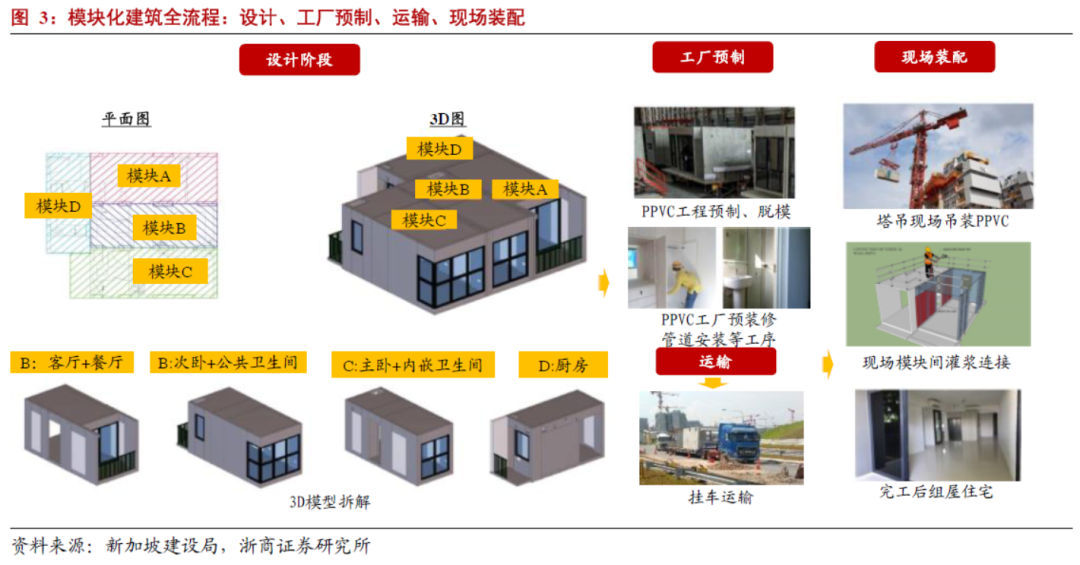 模块化建筑具有装饰质量优、建造速度快、绿色环保三大优点。质量方面,模块化建筑将大部分工序由工地现场转移到工厂内,更高的自动化程度和更优的工作环境使得其装饰质量高于现场工地作业;速度方面,传统施工流程需在现场按流程作业,而模块化建筑工厂和施工现场可同步进行互不干扰,加快了施工速度,现场单模块安装时间压缩到以“小时计”;环保方面,模块化建筑几乎杜绝了现场作业的粉尘、噪声污染,工厂智能化生产可节约耗材,且模块化建筑可反复拆改,可在全寿命周期内实现减碳、节碳。