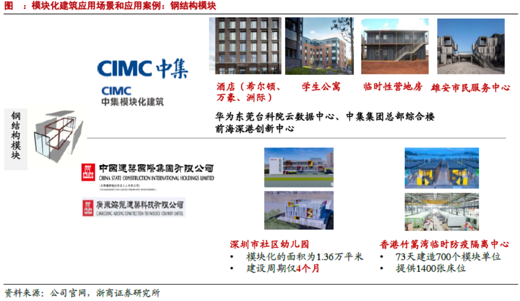 海龙建筑科技:依托中建系统内部设计、施工和项目承接优势,旗下模块化产品采用标准化设计、工厂化生产、一体化装修、便捷化施工和信息化管理,主要面向大陆和香港市场。应用案例方面,规模较大项目主要有深圳市社区幼儿园、香港防疫隔离医院等。