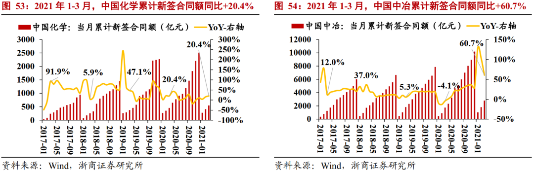 月度累计新签订单看, 2021年1-3月,中国化学、中国中冶累计新签合同额分别为546.8亿元、2805.7亿元,同比分别增长20.4%、60.7%。