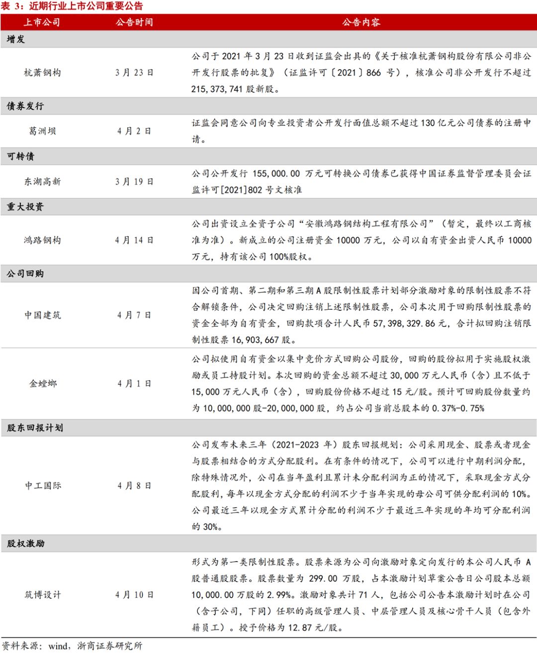 个股:建议重点关注EPC+“专利授权”双轮驱动模式下,有望收获钢结构订单超额增长的精工钢构;重点关注聚焦PC构件制造主业,21年业绩有望超预期的远大住工,关注产能扩张确定性强、毛利率随产能利用率爬坡有望提升的鸿路钢构。