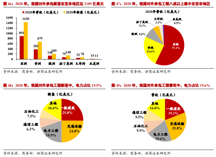 供给端看,中国对外承包工程主要集中在亚非地区,电力工程建设为重要组成业务。2020年,中国对外承包工程业务的营收额达到1559亿美元,新签合同额达到2555亿美元。从洲别分布来看,2020年中国对外承包工程中80%以上业务营收来自亚洲和非洲地区,其中亚洲地区营收、新签分别为891.4、1429.7亿美元,营收占比57.2%;非洲地区分别营收、新签为383.3、679亿美元,营收占比24.6%。从行业分布来看,2020年中国对外承包工程中排名前三的行业分别为一般建筑、交通运输和电力工程。电力工程建设是对外承包工程中重要组成业务,2020年新签、营收占比分别为19.9%和19.6%。