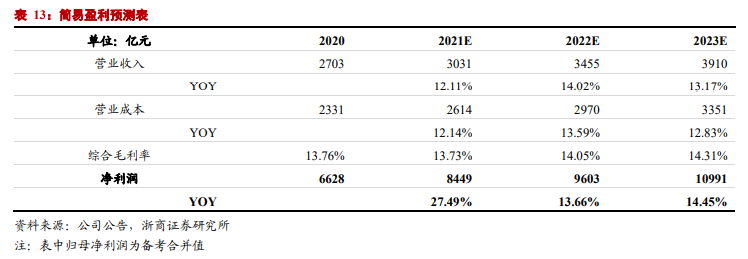 利润端:综合考虑公司各项业务历年毛利率水平和未来清洁能源业务比重提升对毛利率积极影响,我们假设21-23年综合毛利率分别13.73%、14.05%、14.31%。最终预计公司2021-2023年归母净利分别84.49亿元、96.03亿元、109.91亿元,同比分别增长27.49%、13.66%、14.45%,三年复合增速14.05%。