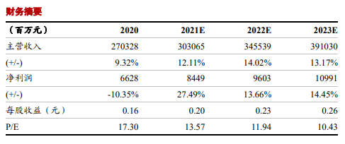 预计公司2021-2023年实现营业收入3031、3455、3910亿元,同比增长12.11%、14.02%、13.17%,实现归母净利润84.49、96.03、109.91亿元,同比增长27.49%、13.66%、14.45%,对应EPS为0.20、0.23、0.26元。现价对应PE为13.6、12.0、10.4倍。基于分布估值法、整体估值法测算公司当前估值偏低,首次覆盖,给予“增持”评级。6.风险提示
