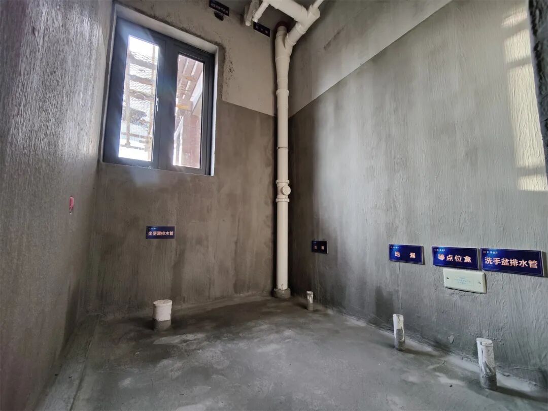管道、水电等排布清晰,厨卫两大主要用水区域,为防止积水与潮湿,地面交界处进行防水强化处理。