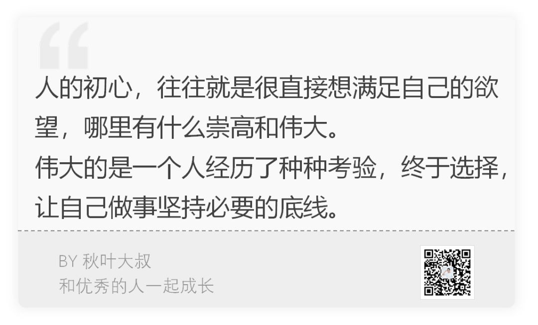 人的初心,往往就是很直接想满足自己的欲望,哪里有什么崇高和伟大。伟大的是一个人经历了种种考验,终于选择,让自己做事坚持必要的底线。