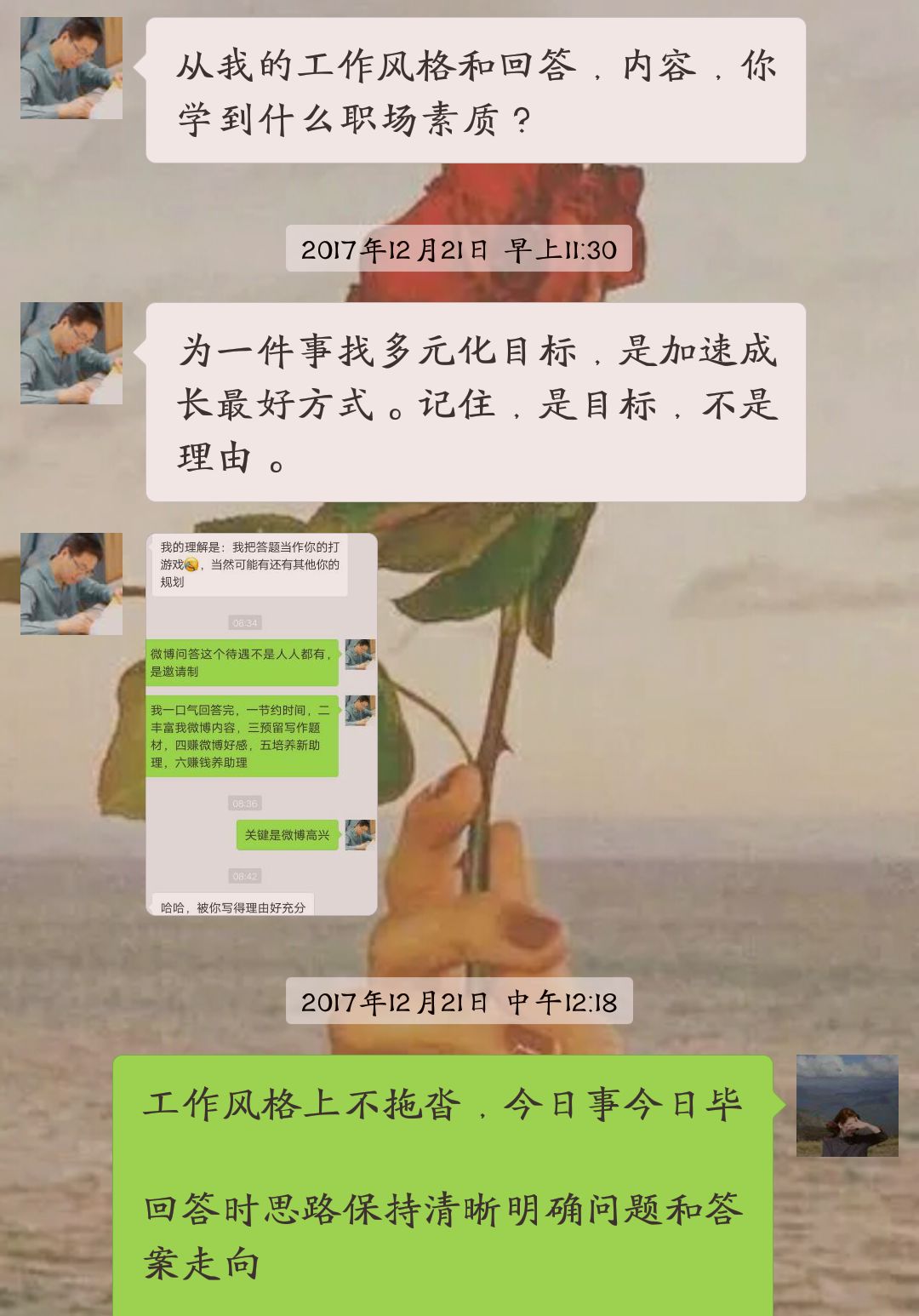 答得快的大叔还不忘虐狗,第二天一早我刚醒就看到大叔问了我一句,看完(我这么短时间回复完20个问题)你有什么感受,学到了什么职场素质?
