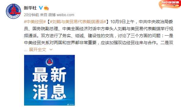 10月9日上午,中共中央政治局委员、国务院副总理、中美全面经济对话中方牵头人刘鹤与美贸易代表戴琪举行视频通话,双方进行了务实、坦诚、建设性的交流。