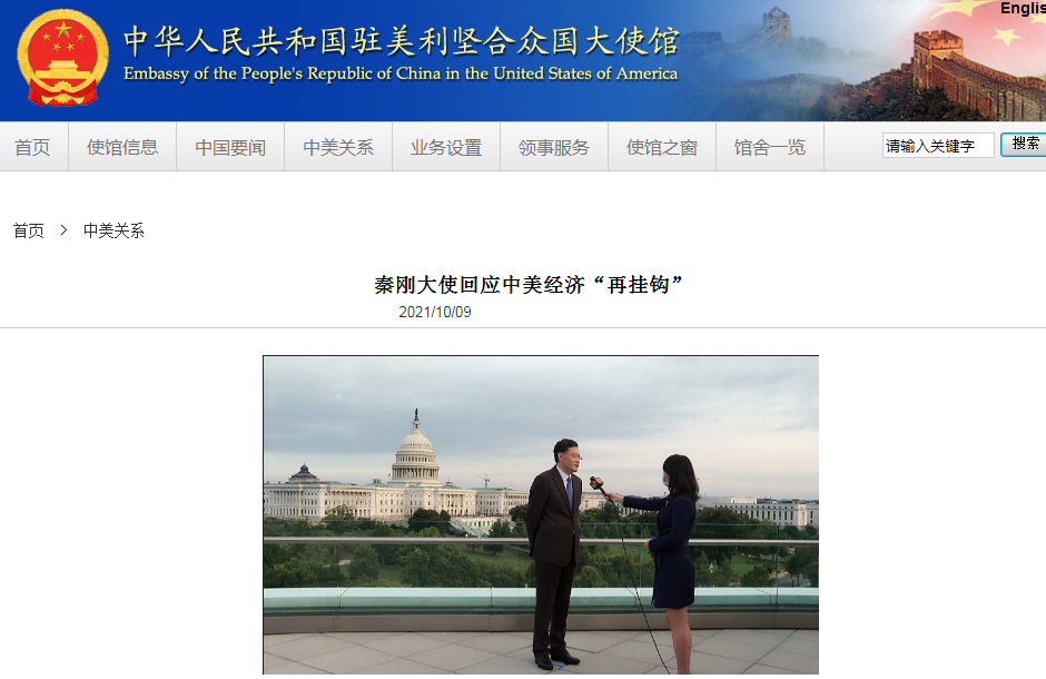 据中国驻美国大使馆网站消息,同日,秦刚大使在华盛顿接受凤凰卫视记者专访,就美国贸易代表戴琪阐述对华贸易政策并谈及美中经济“再挂钩”做出回应。