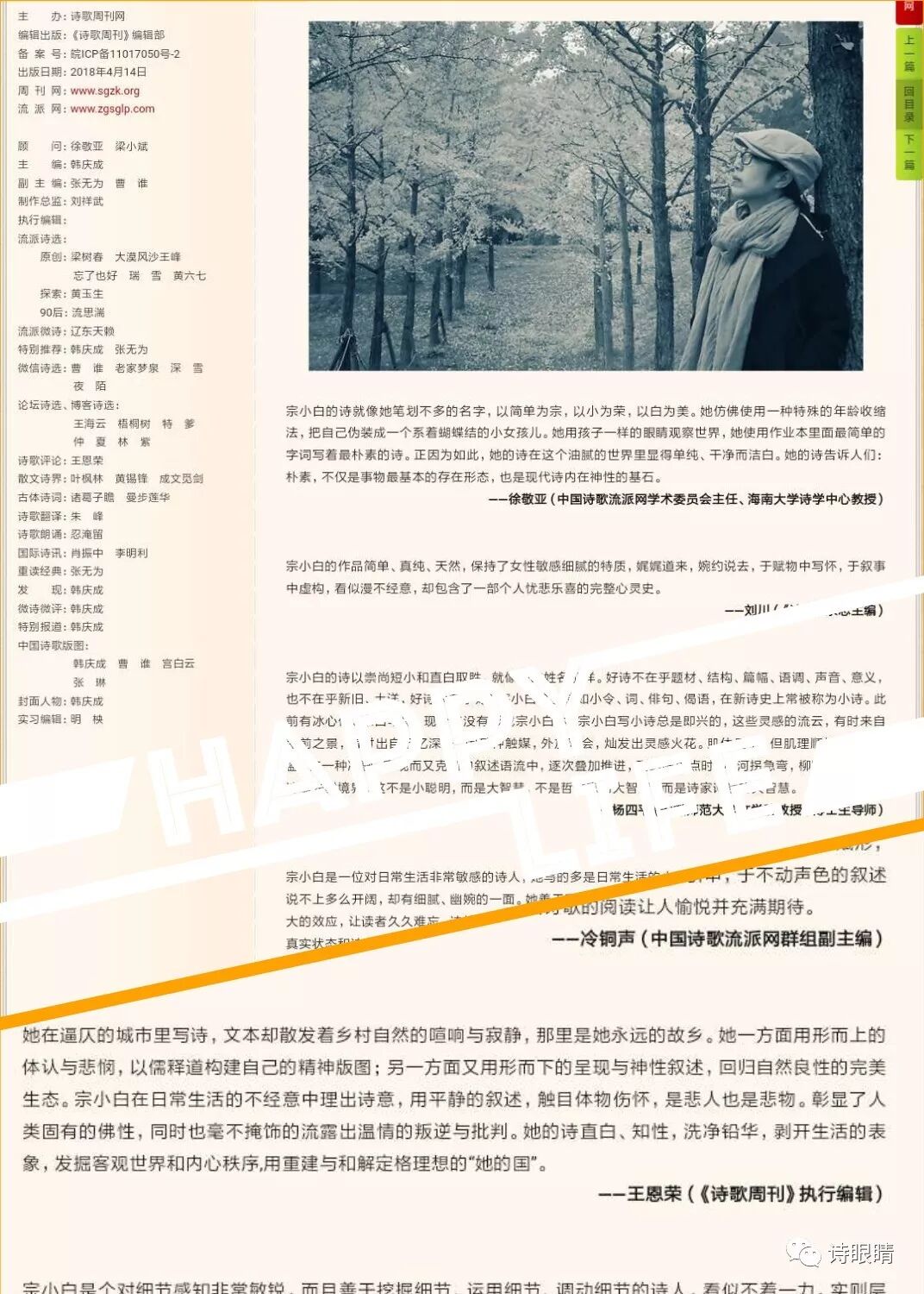 H\ 2018、2、18在《诗歌周刊》297期刊发我两个评:一个是,对诗人宗小白的中国流派网韩选诗的部分诗的综评《入世体物悲悯的情怀,出世思想孤独的狂欢》;