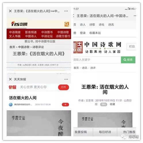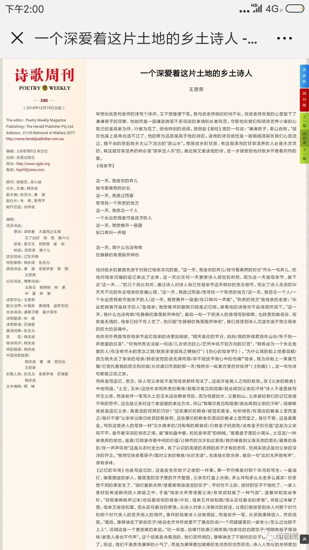 E\ 2018、2、4在《诗歌周刊》295期刊发我对山西诗人王俊才的两组诗《农谚里的麦子》和《善醉之人的乡愁》的诗评《年年春日异乡悲,杜曲黄莺可得知》;