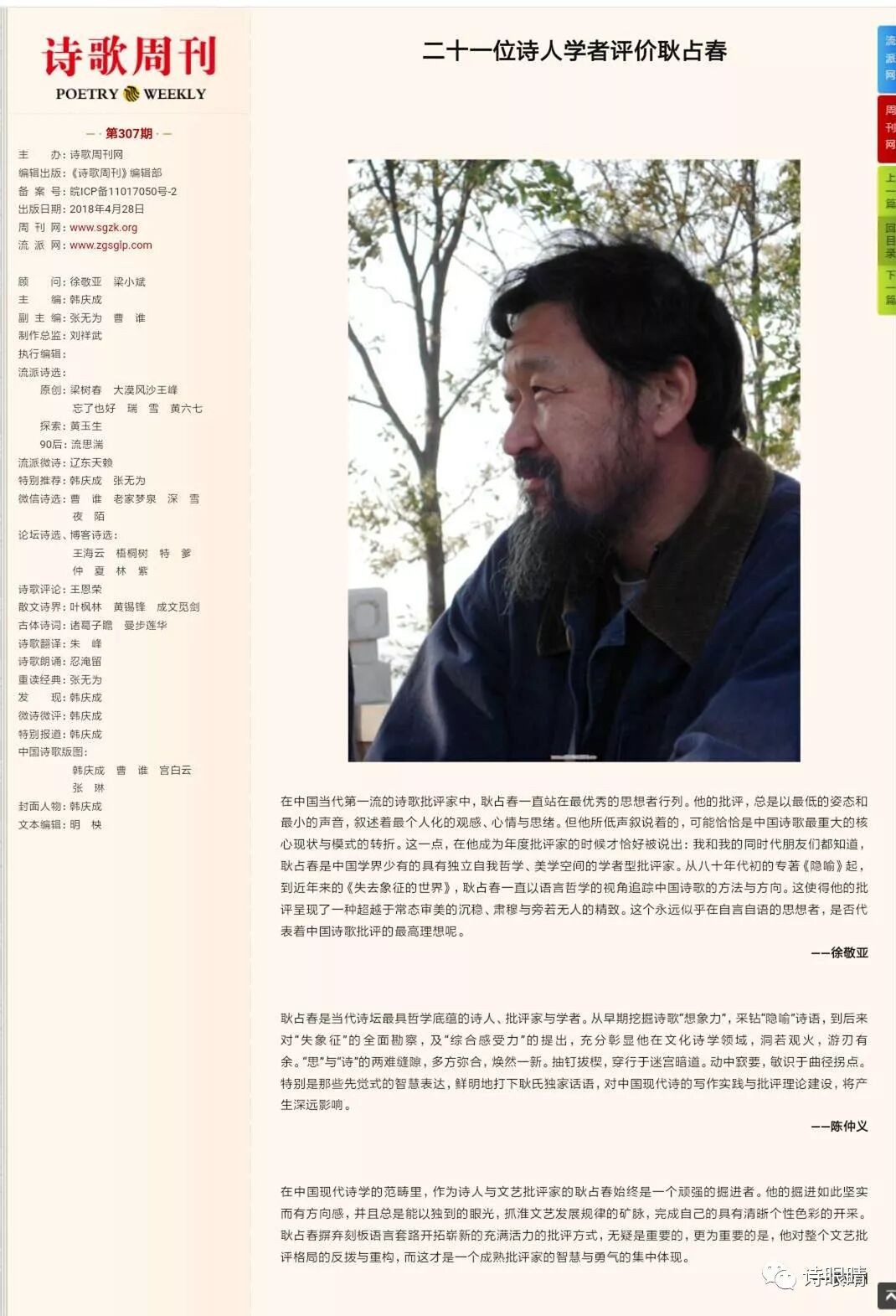 2018年4、28为耿占春当选《诗歌周刊》2017“年度批评家”写授奖词:(地址:http://www.zgsglp.com/thread-763702-1-1.html)