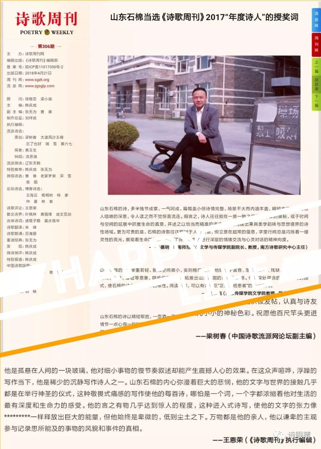 2018年4、22为山东石棉当选《诗歌周刊》2017“年度诗人”写授奖词:(地址:http://sgzk.org/sgzk/300/306/fm/7342.html);