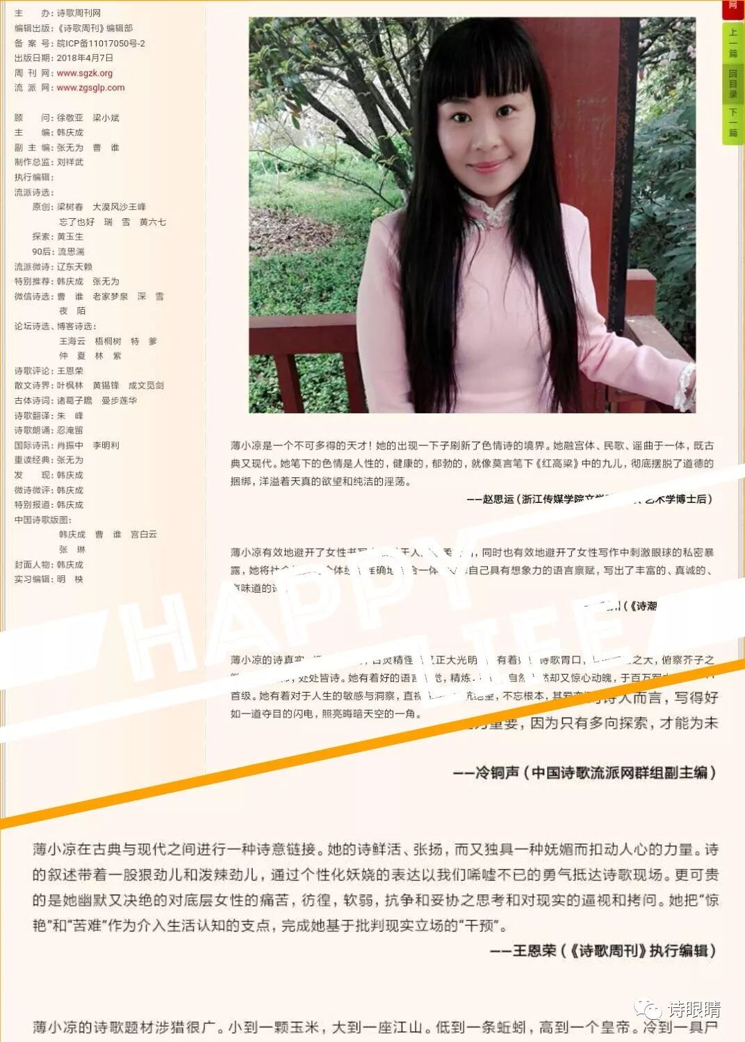 2、2018年4、8为薄小凉当选《诗歌周刊》2017“年度诗人”写授奖词:(地址:http://sgzk.org/sgzk/300/304/fm/6937.html);