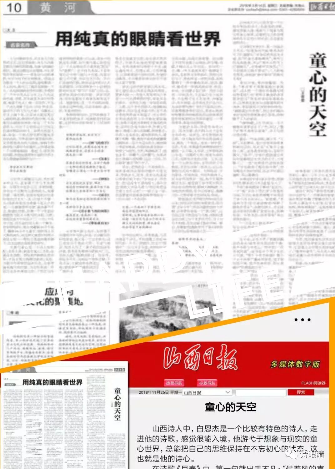 C\ 2018、3、14在《山西日报》黄河版刊发我的对白恩杰的诗评《童心的天空》(地址:http://epaper.sxrb.com/shtml/sxrb/20180314/705267.shtml