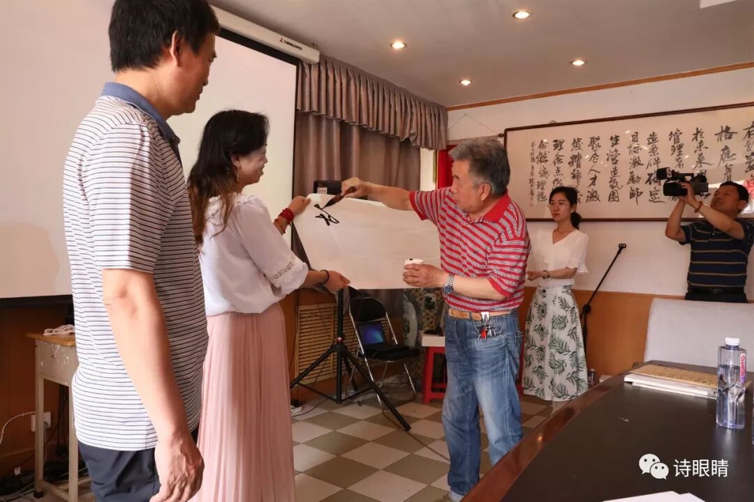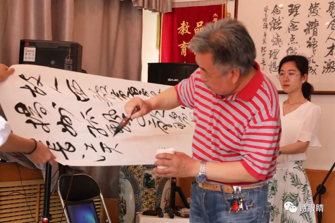 著名书法家葛宝庆为诗人任爱玲及本次活动的承办单位实验三中作悬书表演,并向任爱玲及实验三中赠送该作品;