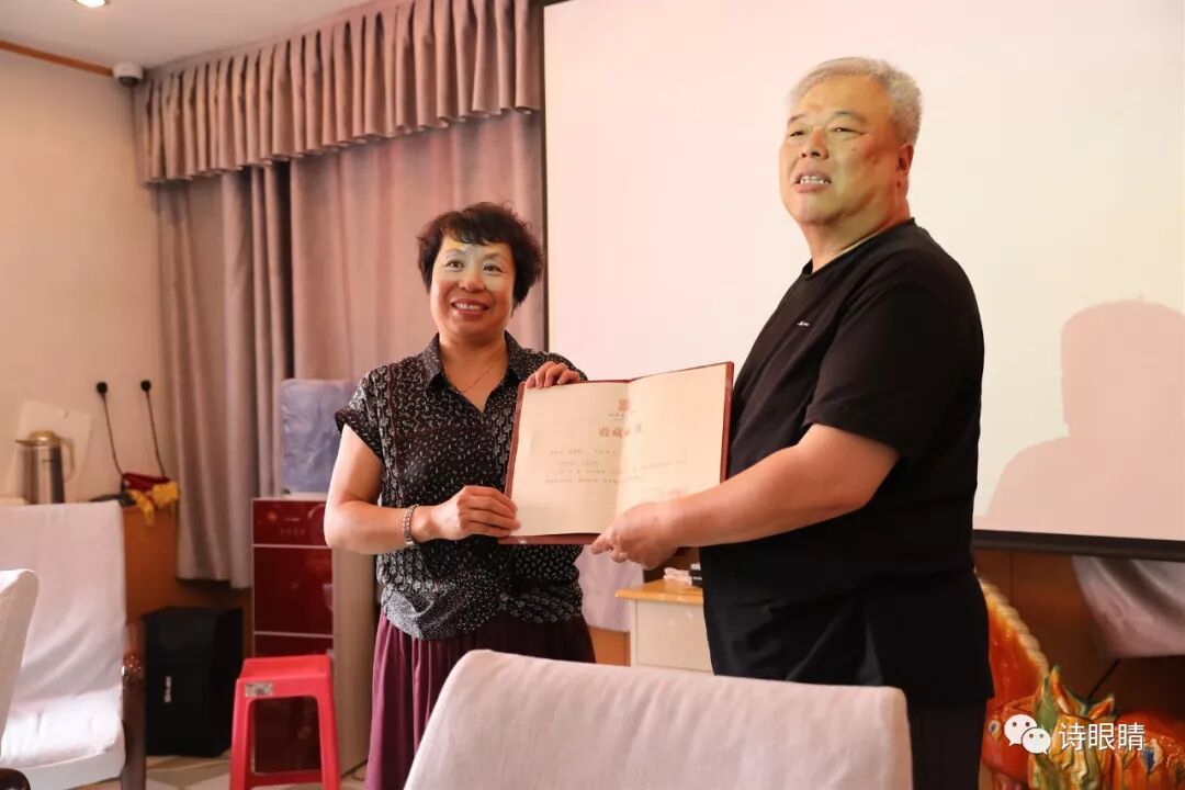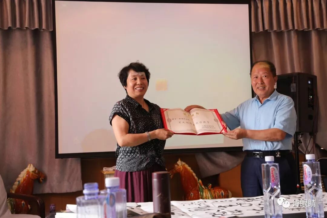 太原诗词学会会长马鸣信为诗人任爱玲颁发“星光创作者荣誉称号”证书;