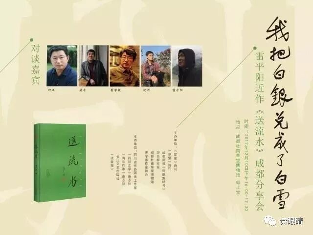 11月18,良辰吉日,雷平阳来武汉《送流水》。雷平阳为什么要送流水?他送走的是流水吗?流水送走之后又意欲何为?长江诗歌出版中心今天推出的雷平阳最新诗集《送流水》会告诉你全部答案!三年前,他还在《基诺山》上,“偏安”,观望一个混杂时代的“渡口”,上个月又去北京《击壤歌》,今天他送流水!他在这部令他自己都最为满意的诗集里表达了一种强烈的还原诗、离开诗、这就是诗的强烈的转型愿望,从沉重转向轻硬,从复杂转向简洁,从他转向我,从我转向无我。无聊,无趣,随性,大度。从送流水到看淡风云,整个百余首诗是一个长长的叹息。