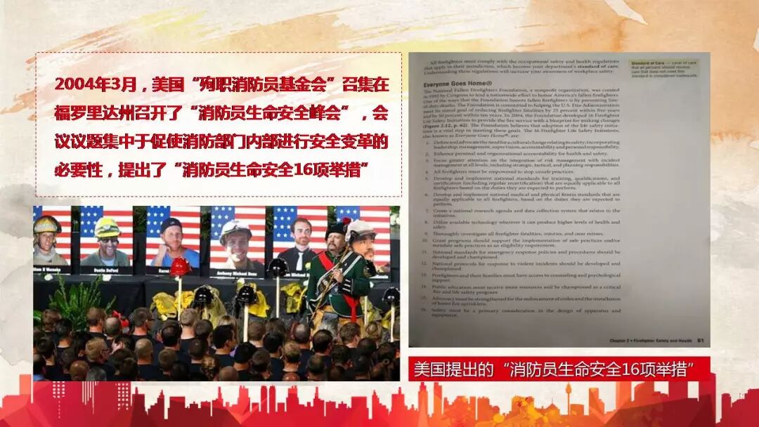 2004年3月,美国“殉职消防员基金会”召集在福罗里达州召开了“消防员生命安全峰会”,会议议题集中于促使消防部门内部进行安全变革的必要性,提出了“消防员生命安全16项举措”(图3)。